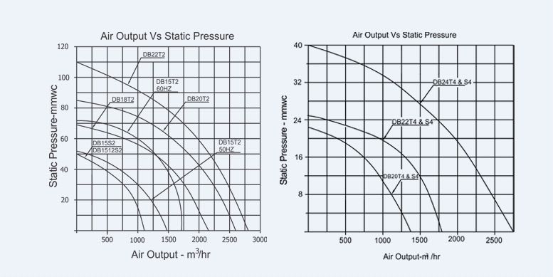| Model | Supply | Air Output @ Static Pressure m3/hr @ mmwc | Motor Model | Speed RPM | Inlet Air Temp. Max oC | Weight Kg | MOC |