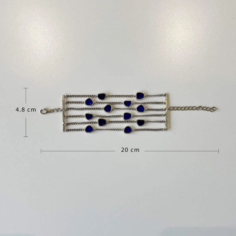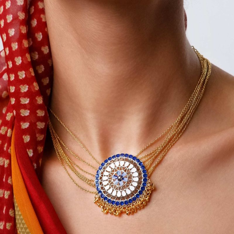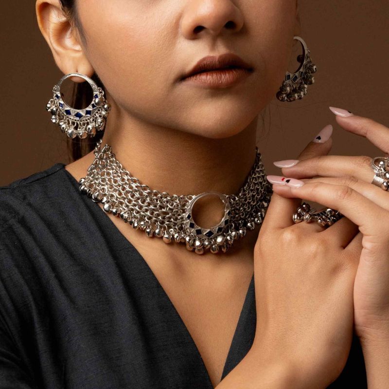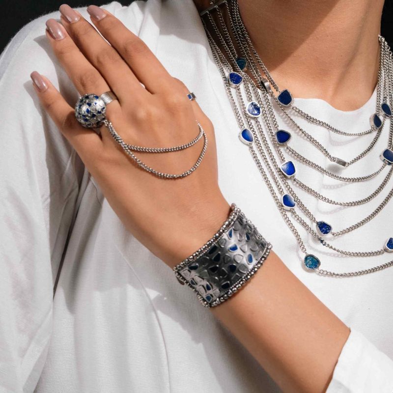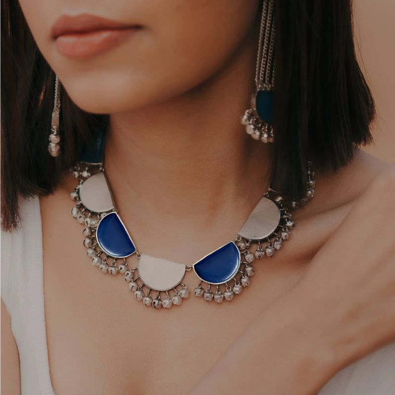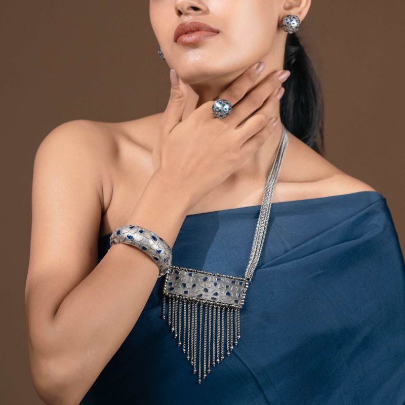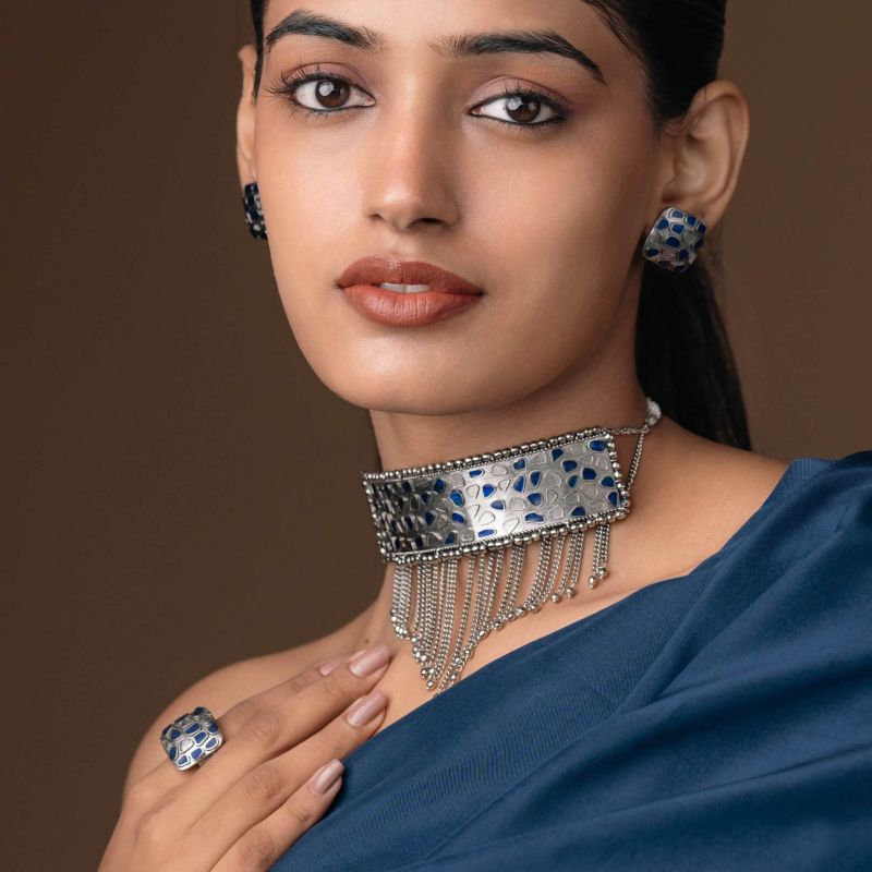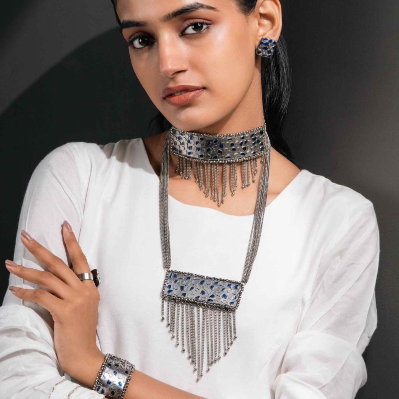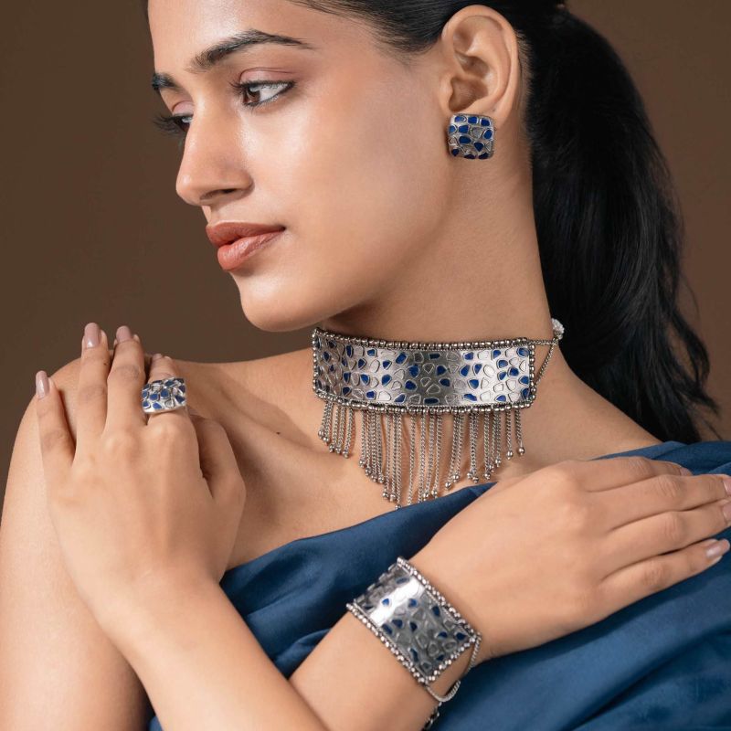 INSPIRATION: Dive into the divine dance of elegance and artistry with our latest collection, RAAS-LEELA. Each piece in this handcrafted brass jewellery collection is a tribute to the timeless beauty and playful spirit of tradition; made by skilled artisans using silver plated brass and sapphire blue enamel. With every piece, you carry a story of love, devotion, and timeless artistry. Let RAAS-LEELA be your statement of style and grace. Just like the Raas Leela of Krishna and the Gopis, this collection is all about connection, beauty, and joyous celebration. Wear these pieces as a reminder of the divine playfulness and timeless charm. DESIGN: This enamelled choker chic is handcrafted using high quality silver plated brass and sapphire blue enamel has a dynamic and eye-catching effect. Each layer of chain is arranged to drape effortlessly and elegantly around the neck. Whether it 's a festive gathering, a wedding, or a casual day out, RAAS choker will most definitely add that touch of elegance and sophistication to your look. STYLE: Silver Plated Brass Handpainted Enamel Handcrafted Statement Jewellery