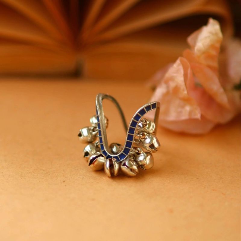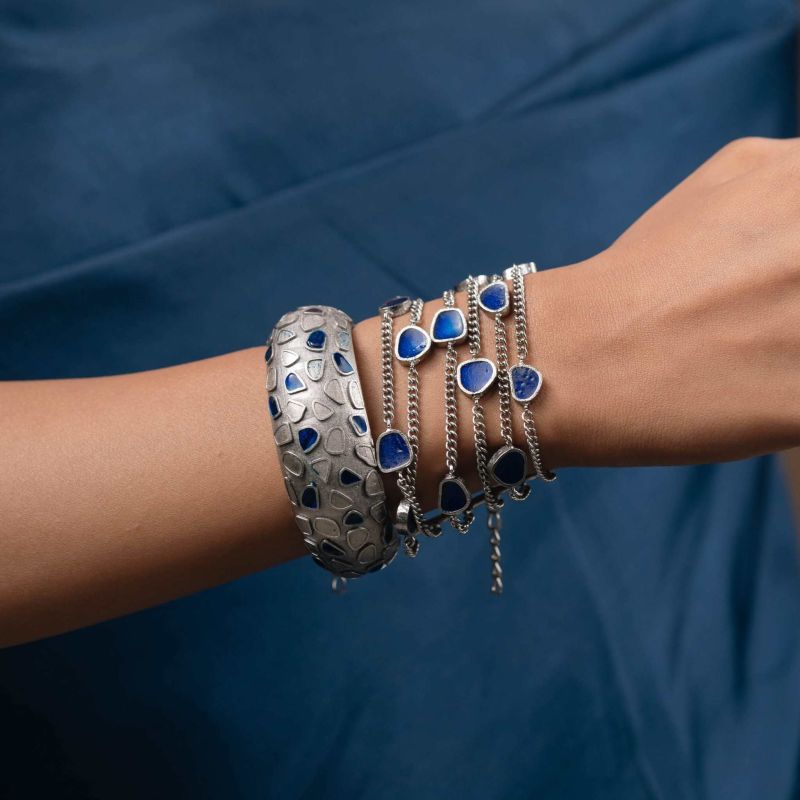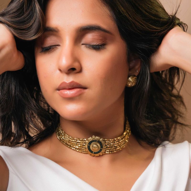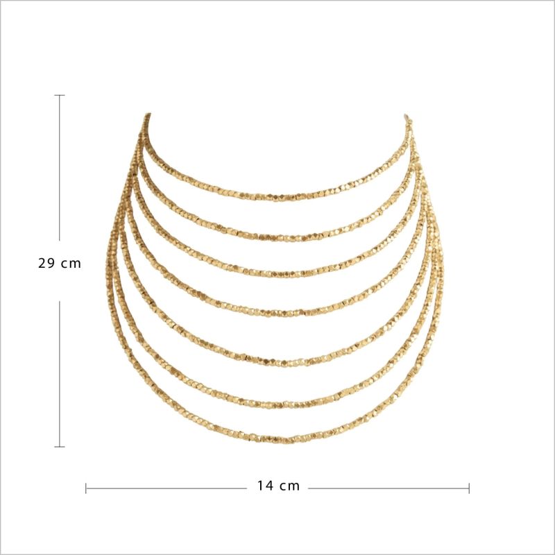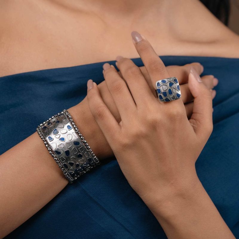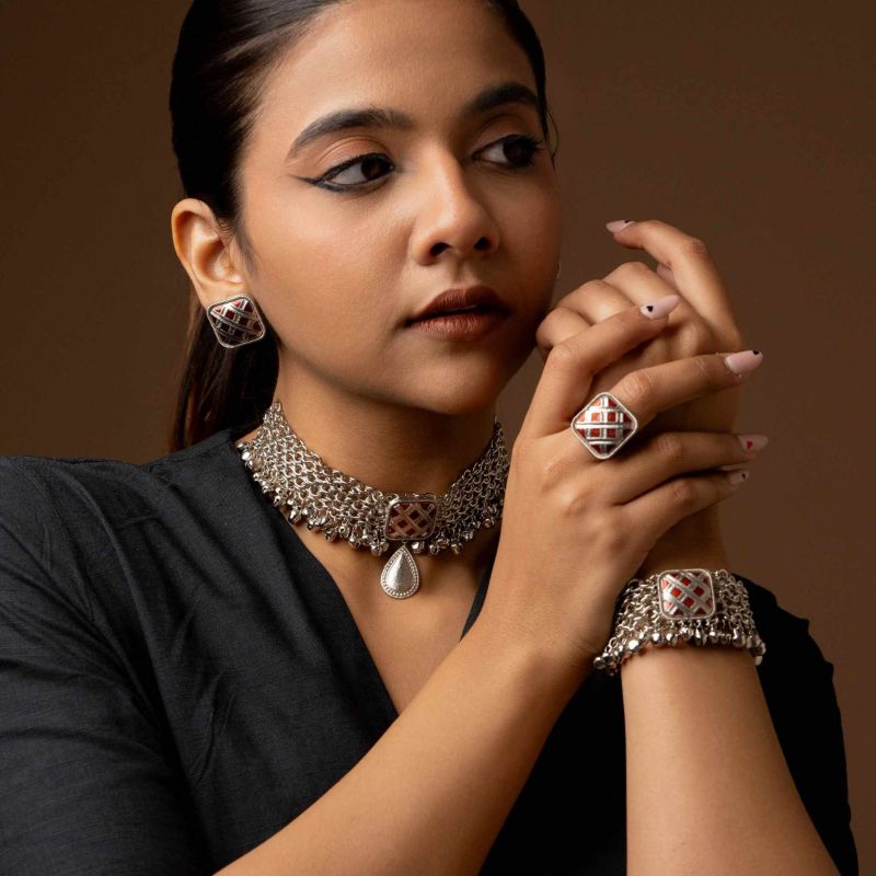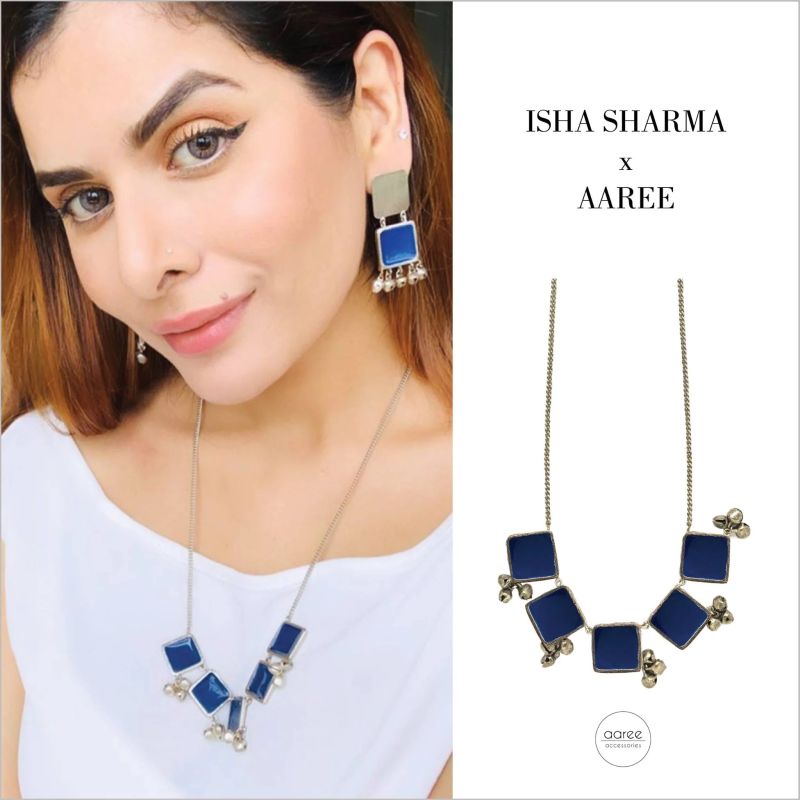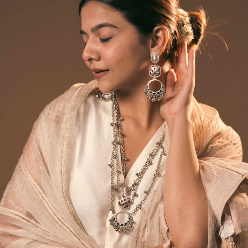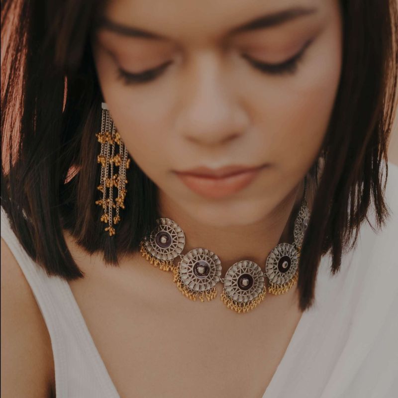 INSPIRATION: Dive into the divine dance of elegance and artistry with our latest collection, RAAS-LEELA. Each piece in this handcrafted brass jewellery collection is a tribute to the timeless beauty and playful spirit of tradition; made by skilled artisans using silver plated brass and sapphire blue enamel. With every piece, you carry a story of love, devotion, and timeless artistry. Let RAAS-LEELA be your statement of style and grace. Just like the Raas Leela of Krishna and the Gopis, this collection is all about connection, beauty, and joyous celebration. Wear these pieces as a reminder of the divine playfulness and timeless charm. DESIGN: This enamelled choker chic is handcrafted using high quality silver plated brass and sapphire blue enamel has a dynamic and eye-catching effect. Each layer of chain is arranged to drape effortlessly and elegantly around the neck. Whether it 's a festive gathering, a wedding, or a casual day out, RAAS choker will most definitely add that touch of elegance and sophistication to your look. STYLE: Silver Plated Brass Handpainted Enamel Handcrafted Statement Jewellery