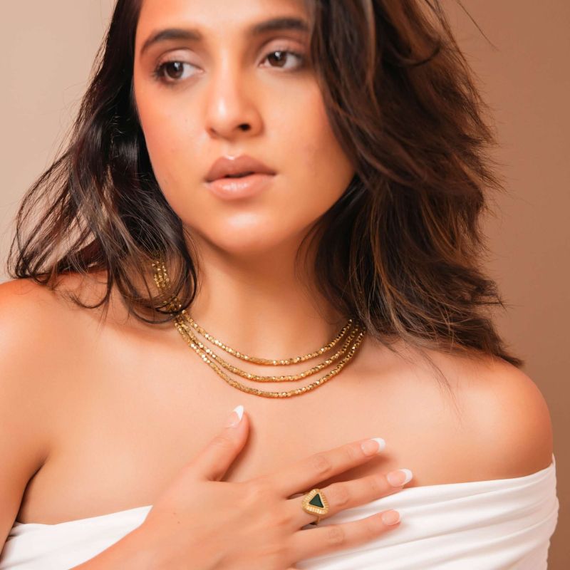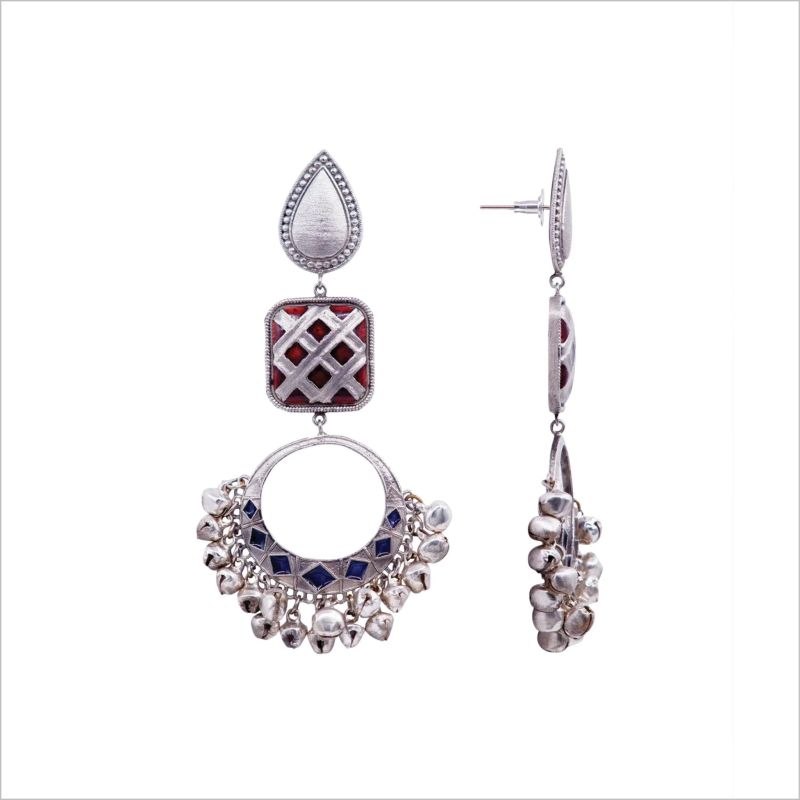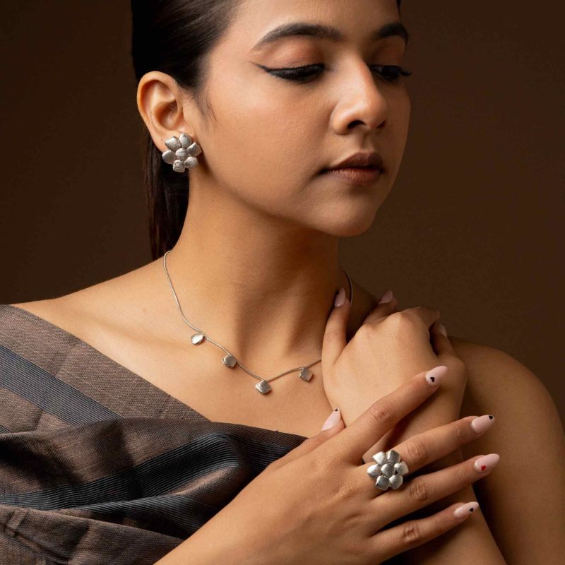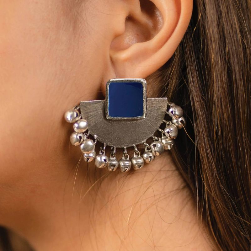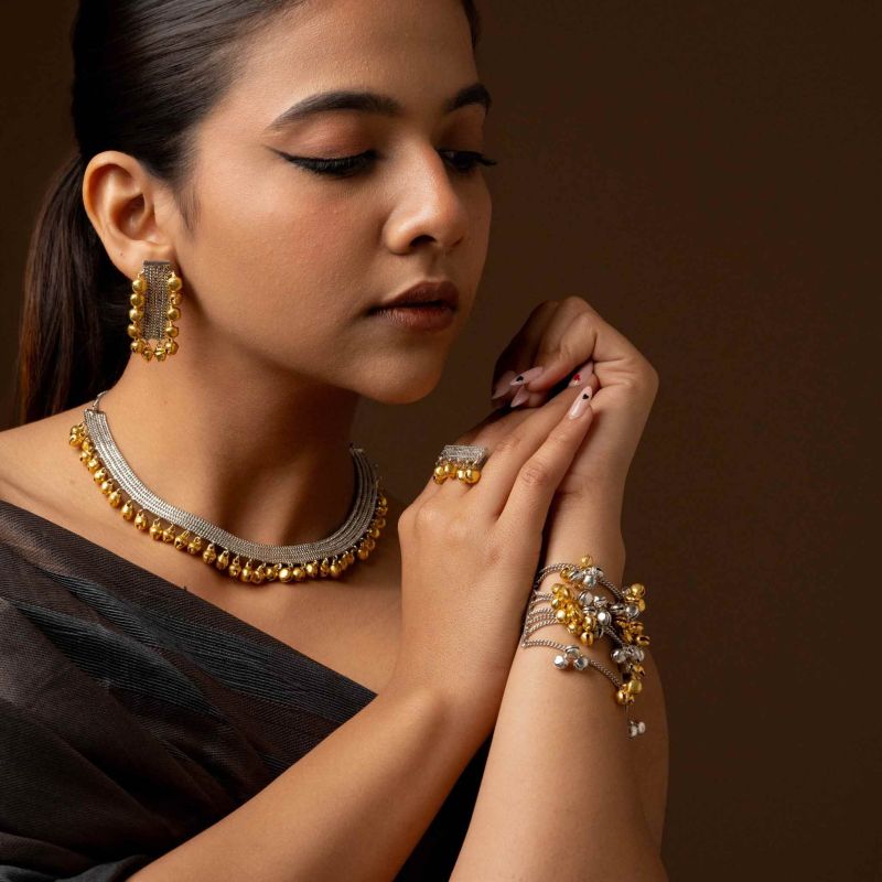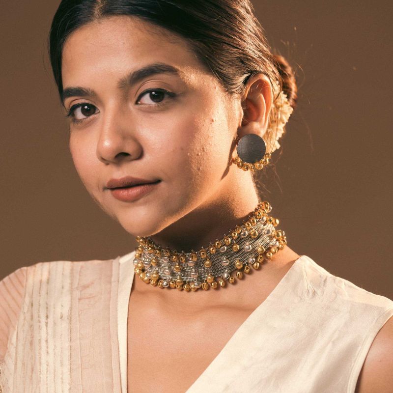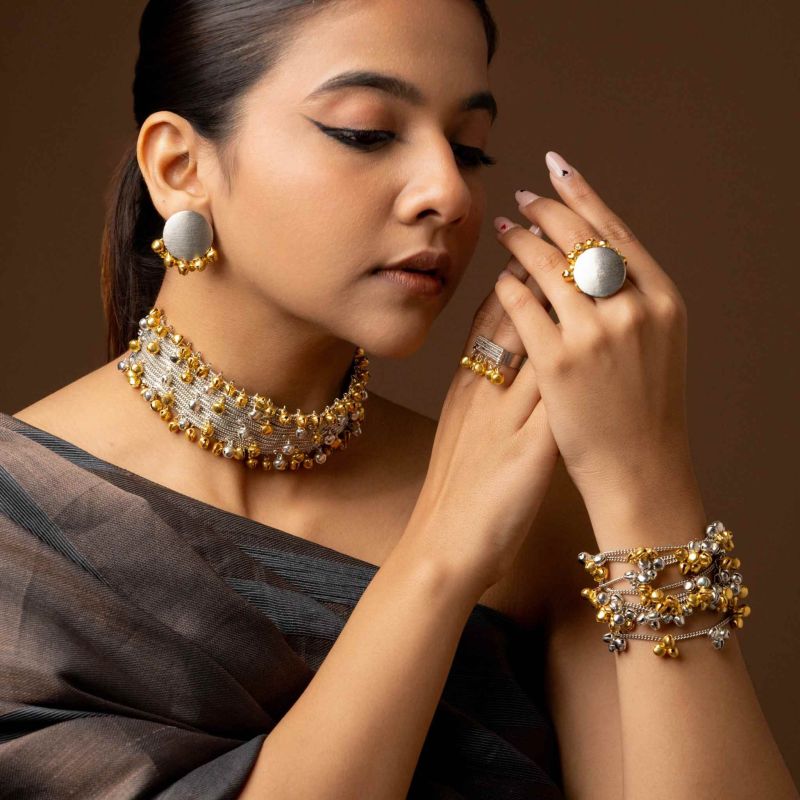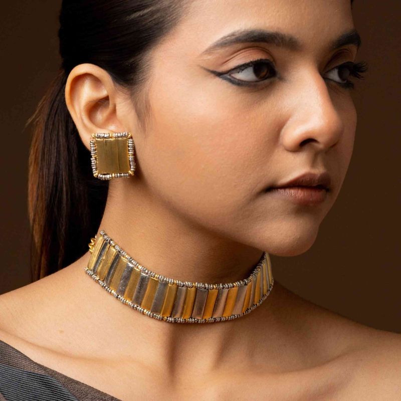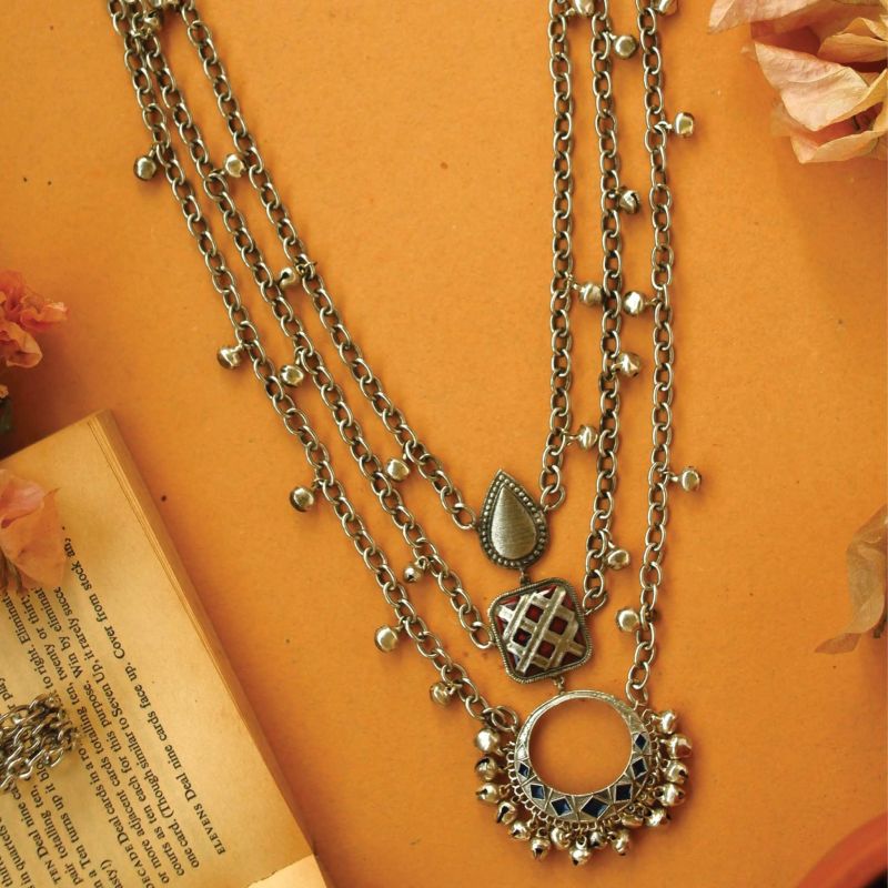 INSPIRATION: Dive into the divine dance of elegance and artistry with our latest collection, RAAS-LEELA. Each piece in this handcrafted brass jewellery collection is a tribute to the timeless beauty and playful spirit of tradition; made by skilled artisans using silver plated brass and sapphire blue enamel. With every piece, you carry a story of love, devotion, and timeless artistry. Let RAAS-LEELA be your statement of style and grace. Just like the Raas Leela of Krishna and the Gopis, this collection is all about connection, beauty, and joyous celebration. Wear these pieces as a reminder of the divine playfulness and timeless charm. DESIGN: This enamelled choker chic is handcrafted using high quality silver plated brass and sapphire blue enamel has a dynamic and eye-catching effect. Each layer of chain is arranged to drape effortlessly and elegantly around the neck. Whether it 's a festive gathering, a wedding, or a casual day out, RAAS choker will most definitely add that touch of elegance and sophistication to your look. STYLE: Silver Plated Brass Handpainted Enamel Handcrafted Statement Jewellery