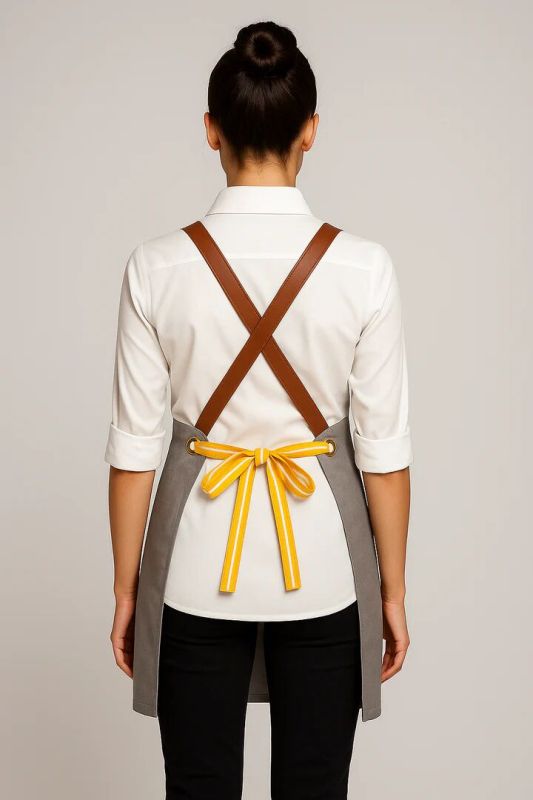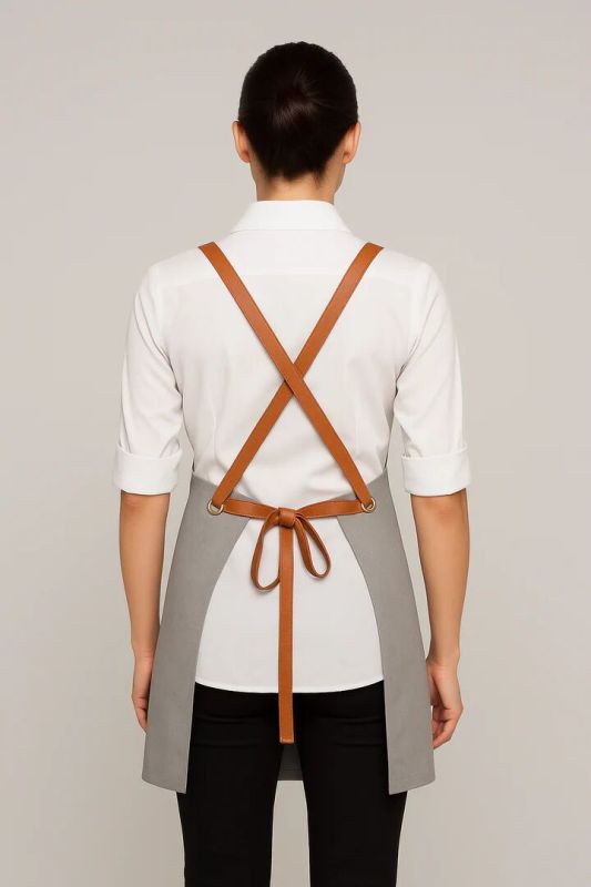Durable Poly/Blend fabricTie up and cross-back Genuine leather straps Interchangeable leather straps are available in 6 colors4 Brass eyelets loops Bartack side loopsReinforced bartacks on pocketsUtility pockets with a separate allotment for pensFits mini iPads and tablets No iron requiredFabrics do not fade Denim Aprons may fade over time Modern and Trendy Cafe/ Restaurant ApronAprons available in 12 colors One size fits mostLength 34 inches x width 28 inchesSuits anyone from 5'2" - 6'2" tall