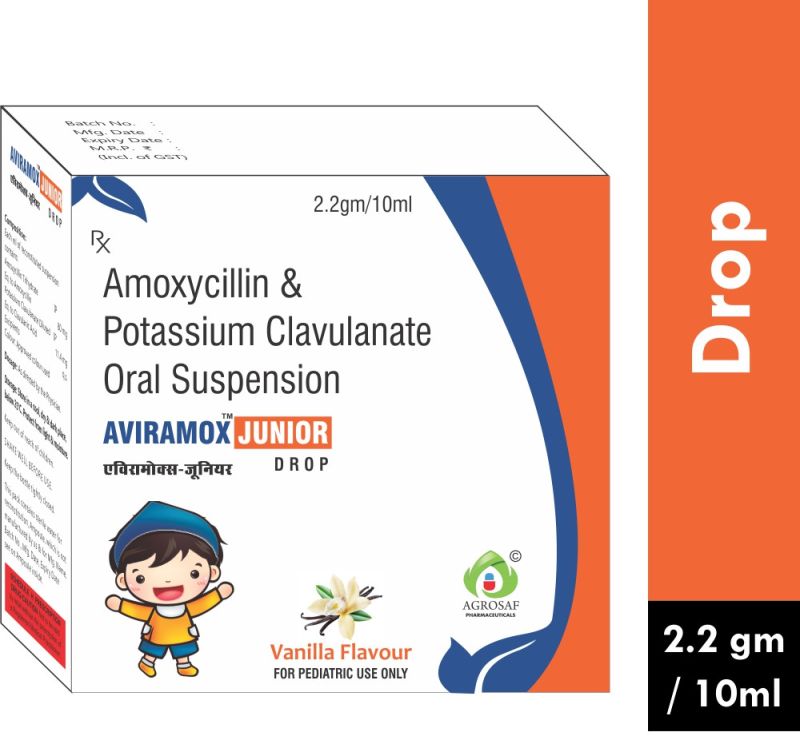 AVIRAMOX Junior Drop is a pediatric antibiotic formulation combining Amoxycillin and Potassium Clavulanate designed to effectively treat bacterial infections in children. It provides broad-spectrum antibacterial action against resistant strains, making it ideal for treating respiratory infections, ear infections, and skin conditions in infants and young children.