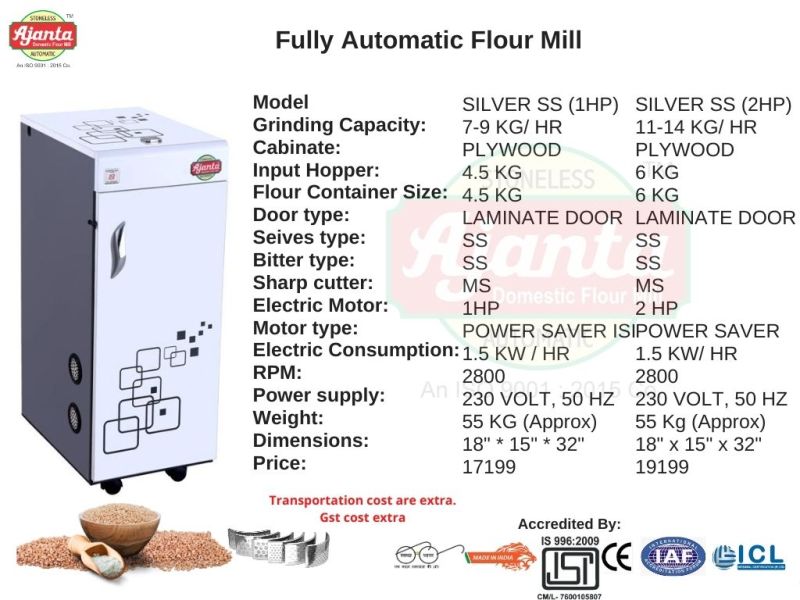 Ajanta Flour mill offers Stone less whichknown as a Domestic flour mill is anefficient and economic way to grind alltype of Cereals. Pulses and Dry spices.like wheat, besan, rice, bajari, maize, jowar, rava, udad, dhaniya, daliya, tomoong, Turmericetc.6 types of sieves (jaalis) provided to grindany fineness to make different types ofRotis, dals, and masala