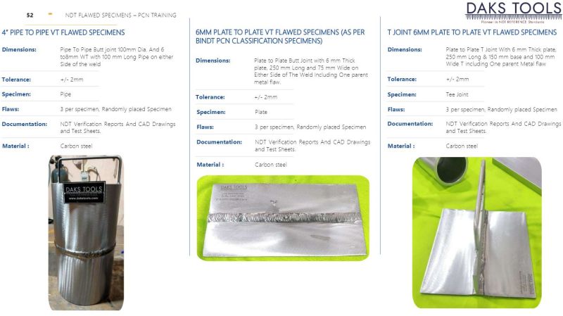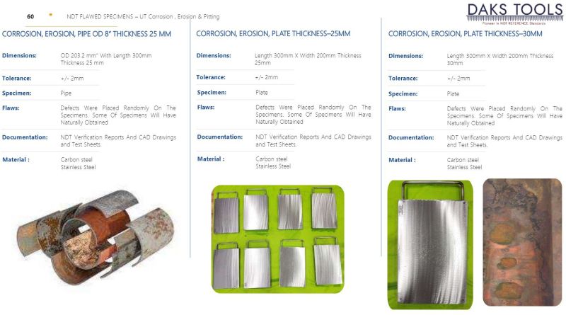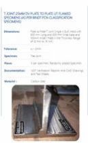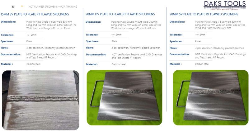 Dimensions:Length 300mm X Width 200mm Thickness 30mm.Tolerance:+/- 2mm.Specimen:Plate.Flaws:Defects Were Placed Randomly On The Specimens. Some Of Specimens Will Have Naturally Obtained.Documentation:NDT Verification Reports And CAD Drawings and Test Sheets.Material :Carbon steel, Stainless Steel.