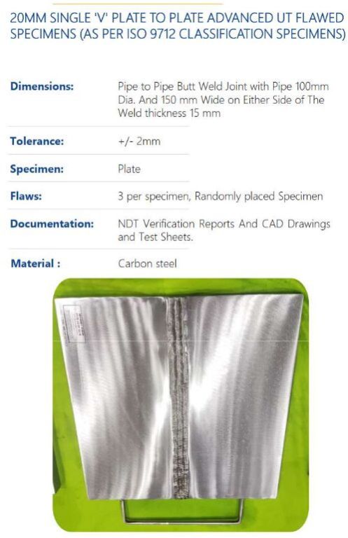 20MM SINGLE 'V' PLATE TO PLATE ADVANCED UT FLAWED SPECIMENS (AS PER ISO 9712 CLASSIFICATION SPECIMENS).