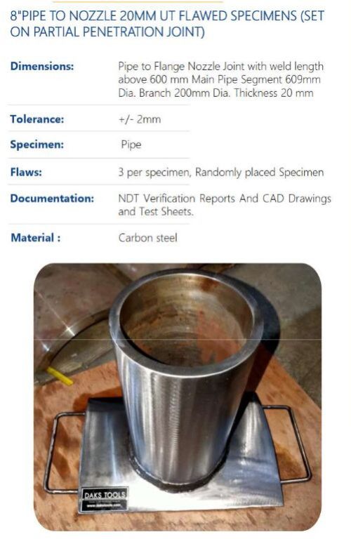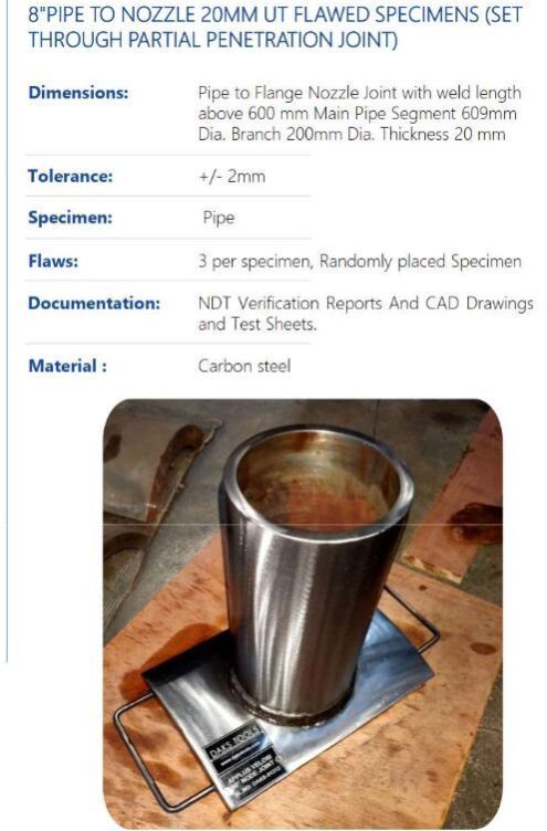 8"PIPE TO NOZZLE 20MM UT FLAWED SPECIMENS (SET THROUGH PARTIAL PENETRATION JOINT).Dimensions:Pipe to Flange Nozzle Joint with weld length above 600 mm Main Pipe Segment 609mm Dia. Branch 200mm Dia. Thickness 20mm.