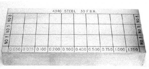 Geometry:Four EDM slots with depths of 20, 40, 60, and 80% and a width of.031 are present in the block ". The common thickness is 1.00 ".