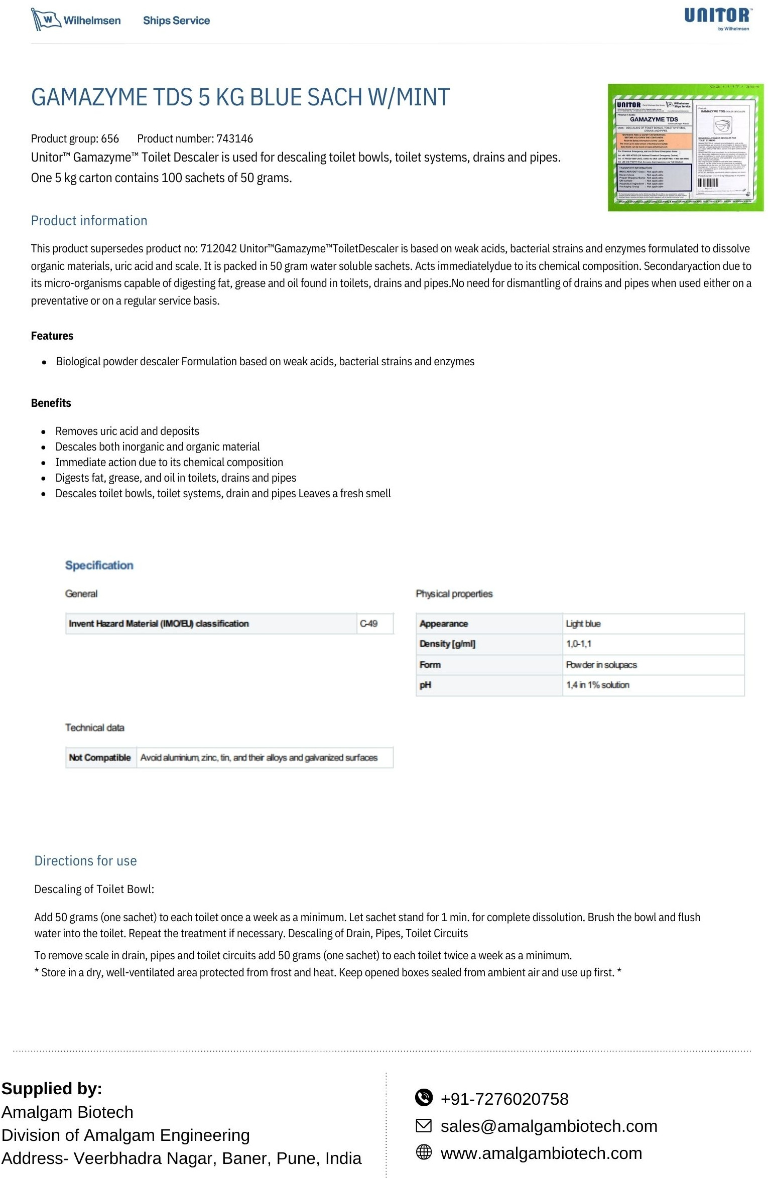 Description: Unitor™ Gamazyme™ TDS Blue is a biological powder descaler formulated with weak acids, enzymes, and bacterial strains to dissolve uric acid, organic waste, and scale buildup in toilet bowls, drains, and pipes. Supplied in 50g water-soluble sachets, it acts fast and leaves a fresh scent without requiring dismantling or harsh chemicals.
