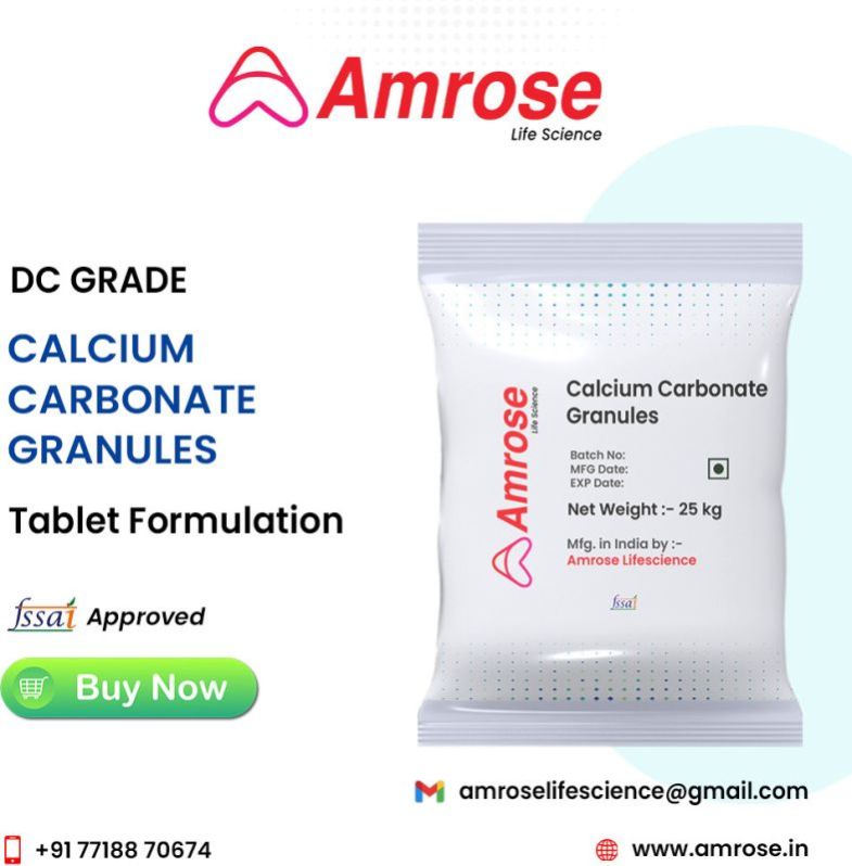 Amrose Lifescience produces a range of products using DC granules, which are designed for direct formulation into tablets and capsules for the pharmaceutical, food, nutraceutical, and veterinary industries. These granules simplify the manufacturing of calcium tablets and capsules by enhancing flowability, minimizing dust and wastage, and reducing production time, labor, machinery, energy, and capital costs. This results in improved overall stability of the final formulation.
