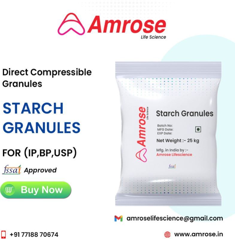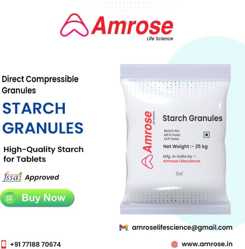 Starch Granules DC Grade are high-quality, pre-gelatinized starches ideal for direct compression tablet formulations. They offer excellent flow properties, reduce dust, and ensure consistent tablet hardness and stability. Ideal for pharmaceutical and nutraceutical applications, these granules streamline production, enhance efficiency, and improve overall formulation performance.