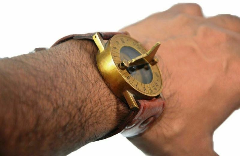 How about wearing a watch that shows a time with the sun's shadow only? Here is a rough outdoorsy solid brass pocket sundial wrist watch with real handmade strap. fantastic pioneer look. This is for the person who cares only vaguely about time! Great novelty piece. The strap is totally handmade and. Don't expect a machine finish for the bracelet, it will not go with the Pioneer look.
