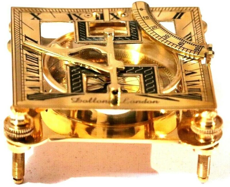 This stunning 3" sundial compass is fully functional. The legs are completely adjustable for any surface. Pioneers would set the compass to the North, then use the hinged sundial to adjust the angle given the season and be able to give very accurate time. This fully engraved piece is made to last a lifetime. The diameter of the sundial is about 3" across. It will make a great addition to any nautical home decor or maritime collection.
