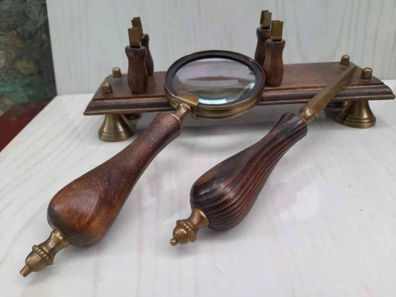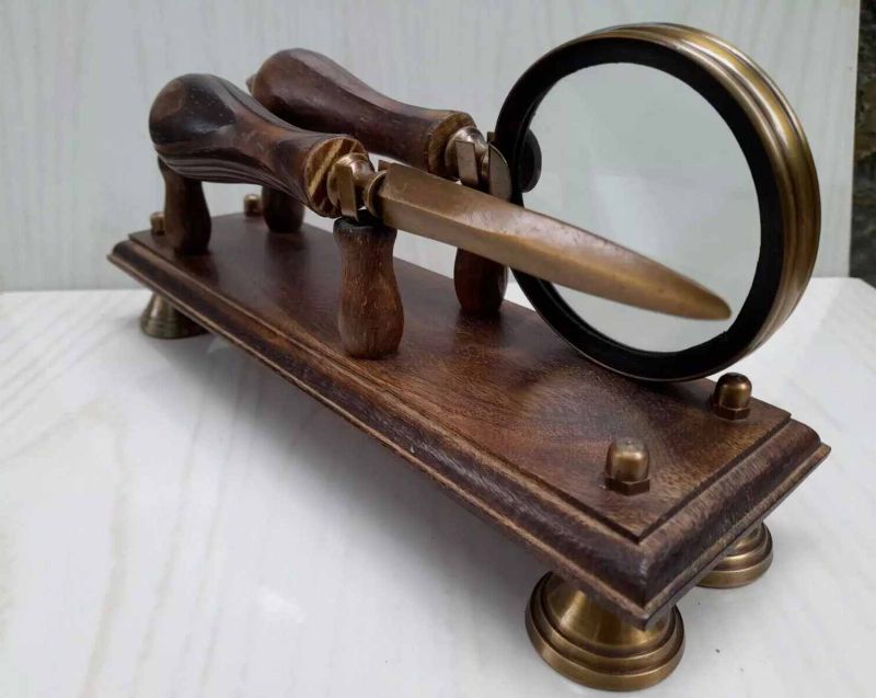 Brass Desk Set Letter Opener & Magnifying Glass Wood Handle Magnifier With Base