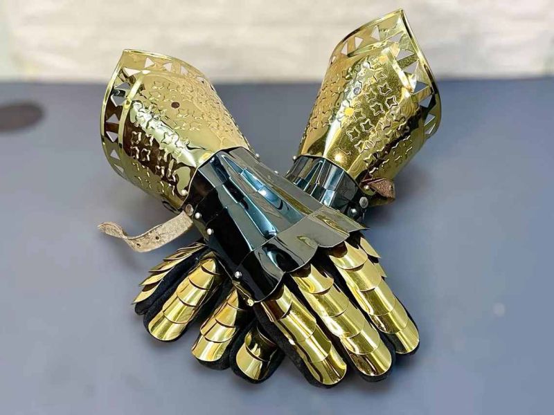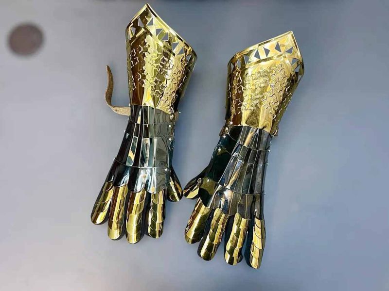 Medieval Stainless steel rust free Golden Gauntlet Armor with black leather gloves inside functional finger for LARP & re-enactment use.