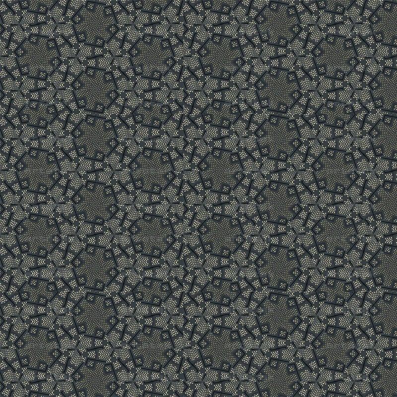 This geometric tessellation exudes a futuristic vibe with its sharp interlocking polygons and sleek symmetry. The muted metallic monochrome tones, contrasted by dotted light accents, create a high-tech, digital aesthetic. Its repeating pattern feels dynamic, evoking advanced algorithms or artificial intelligence design. Perfect for modern textiles, it embodies innovation and forward-thinking style