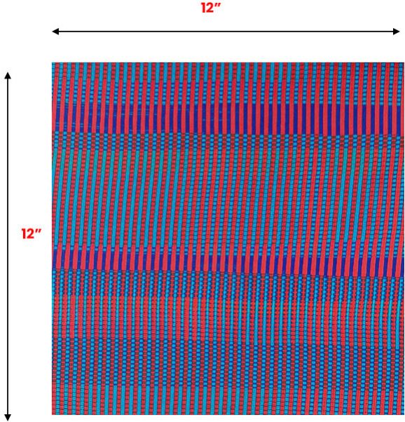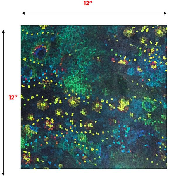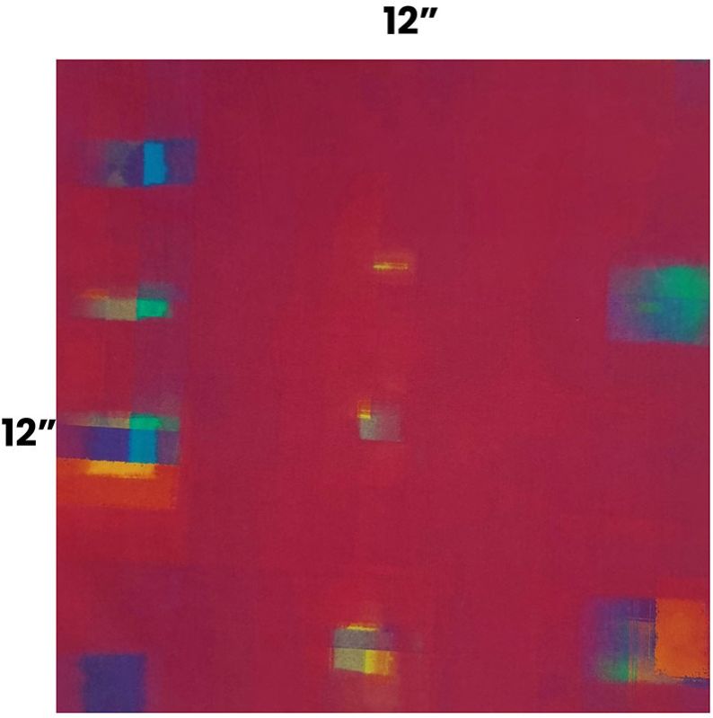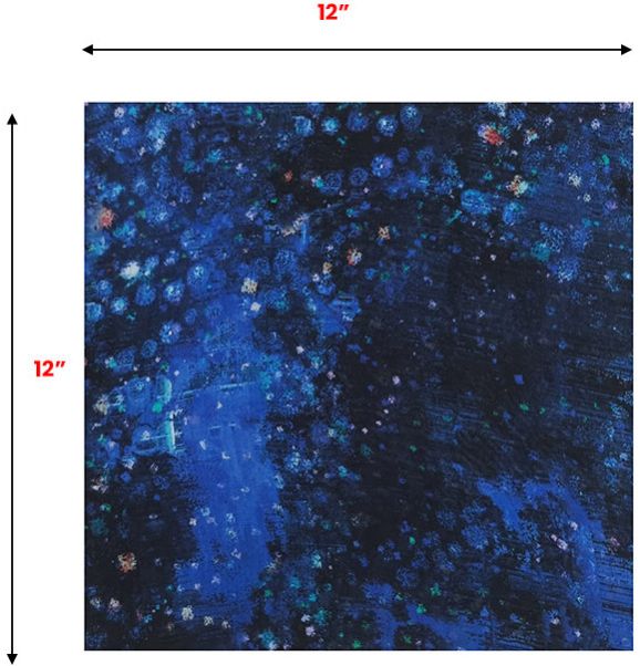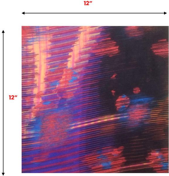 The print offers a variation with softer blending of blues, reds, and purples, achieving a warmer, more vibrant effect. This piece seems to pulse with energy and vibration.
