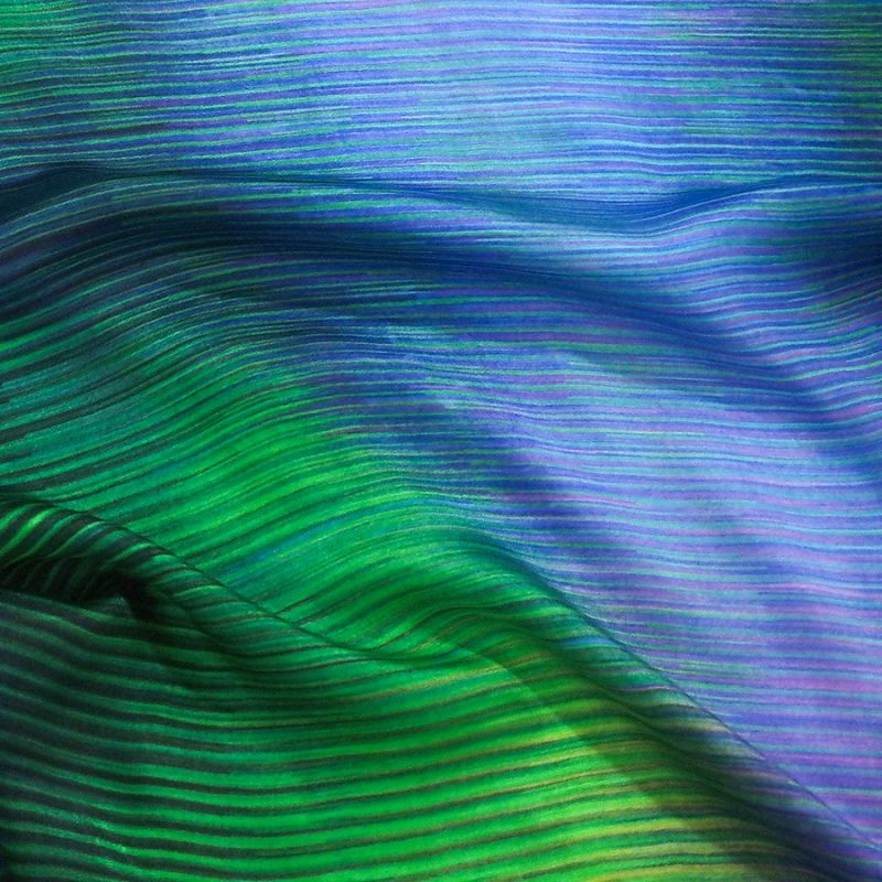 This print features a mesmerizing gradient of green, yellow, and purple hues, blended seamlessly into each other. The horizontal lines create a sense of motion and fluidity and transformation