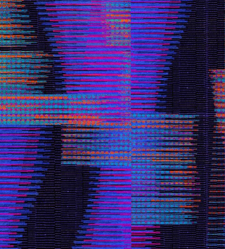 This print features a lively composition of horizontal stripes overlaid with textural elements in a range of pastel colors. The layers of color and texture contribute to a visual impression of wear and age that is yet clean and futuristic