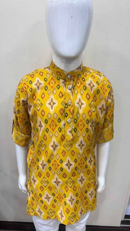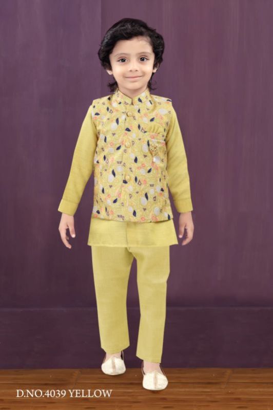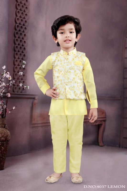 This elegant and vibrant yellow kurta set for kids is perfect for festive occasions and traditional events. The kurta is crafted from premium silk fabric, giving it a luxurious sheen and smooth feel. Intricate floral motifs add a touch of class, while the straight cut and comfortable fit make it ideal for children.