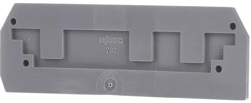 282-308 End and Intermediate Plate (2.5 mm Thick, Gray) from WAGO is used for insulating and separating terminal blocks on a DIN rail. It ensures proper organization, electrical isolation, and safety in control panels.