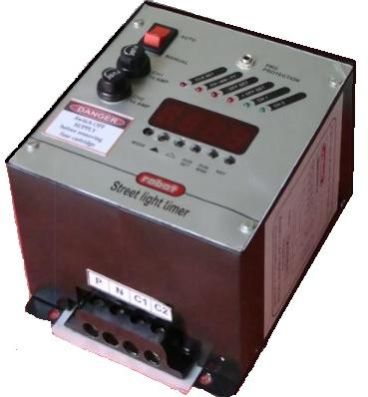Micro controllers RTC has battery backup for more than 10 years; hence the set program remains intact even in power failure condition. Enough precautions for line supply surge are taken. Three Output channel relays operate the electrical contactor that ultimately controls the streetlights. Manual override switch is provided for Manual and Auto operation.