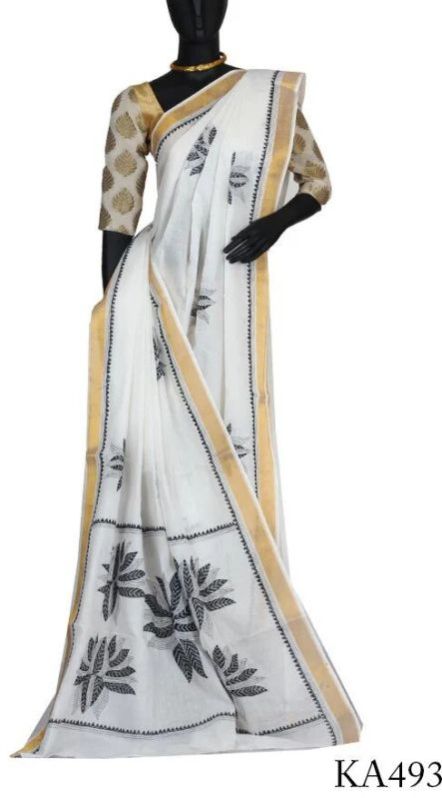 The Stylish Cotton Kantha Stitch Saree is now all the more glamorous thanks to the hand stitch work. This single coloured thread work enhances the beauty to the utmost level offering the perfect and the best look. The flower pattern work in different shades of colours adds a different flavor to this Kerala Cotton Saree bringing an uniqueness that is truly unparallel.