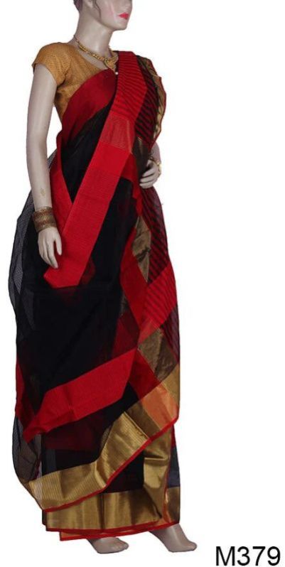 Made of silk and cotton, Black colour saree with wide Red and Golden border with zari work pallu and border- look even more beautiful. Gorgeous SICO Maheshwari Saree - It is also known for one of Indias finest fabric, and handloom weaving The Maheshwari Sari. The graceful & sophisticated design is inspired by the local architecture and striped pallu. Once an exclusive privilege of the royalty has become an established choice of the woman. Free unstitch Blouse piece of this saree.