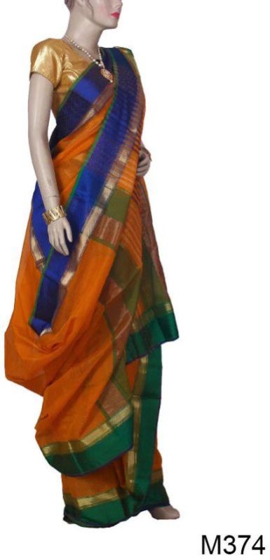 Made of silk and cotton, Golden yellow colour saree with wide Green & Blue border on pallu with zari & jute work - look even more beautiful. It is also known for one of Indias finest fabric, and handloom weaving Handloom (silkcotton) Maheshwari Saree. The graceful & sophisticated design is inspired by the local architecture and striped pallu. Once an exclusive privilege of the royalty has become an established choice of the woman. Free unstitch Blouse piece of this saree.