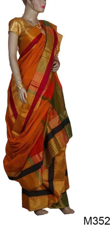 Made of silk and cotton, Orange colour saree with wide Black & Golden Yellow border on pallu with zari work - look even more beautiful. It is also known for one of Indias finest fabric, and handloom weaving Maheshwari Handloom (cottonsilk) Saree . The graceful & sophisticated design is inspired by the local architecture and striped pallu. Once an exclusive privilege of the royalty has become an established choice of the woman. Free unstitch Blouse piece of this saree.
