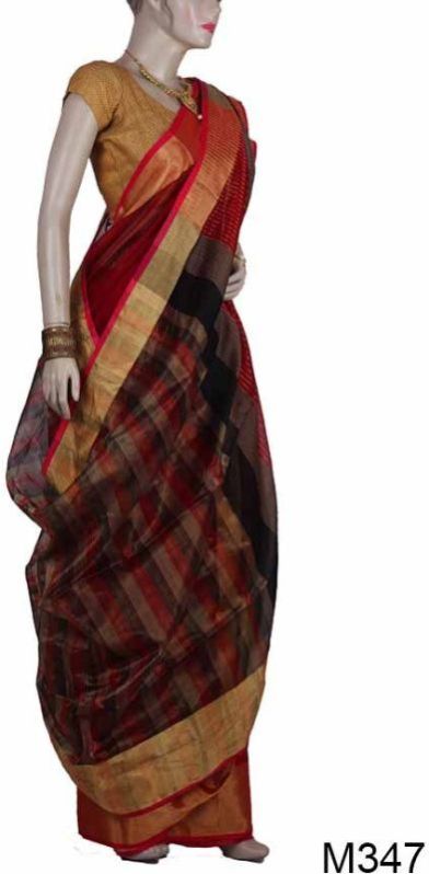 Made of silk and cotton, Brown colour saree with wide Black and Red border on pallu with zari and jute work - look even more beautiful. It is also known for one of Indias finest fabric, and handloom weaving Handloom Maheshwari Wideborder Saree. The graceful & sophisticated design is inspired by the local architecture and striped pallu. Once an exclusive privilege of the royalty has become an established choice of the woman. Free unstitch Blouse piece of this saree.