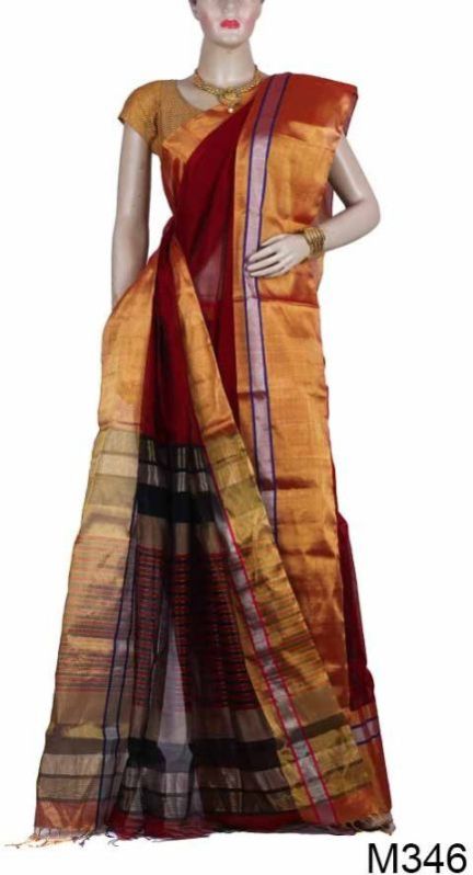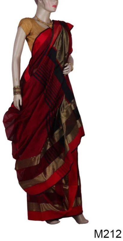 Made of silk and cotton, Maroon colour saree with wide Black , Golden Yellow and Red border on pallu with zari work - look even more beautiful. Indian Ethnic Maheshwari Saree, It is also known for one of Indias finest fabric, and handloom weaving The Maheshwari Sari. The graceful & sophisticated design is inspired by the local architecture and striped pallu. Once an exclusive privilege of the royalty has become an established choice of the woman. Free unstitch Blouse piece of this saree