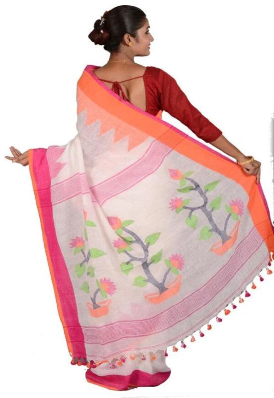 In the modern generation - Linen saree new updation of Handloom Saree's Industry. It is very soft & comfortable with artistic motif design gives you new look. The flower pattern work in different shades of colours adds a different flavour to this Designer Organic Linen Handloom Saree bringing an uniqueness that is truly unparallel. Matching Blouse piece attach with this white bengali saree.