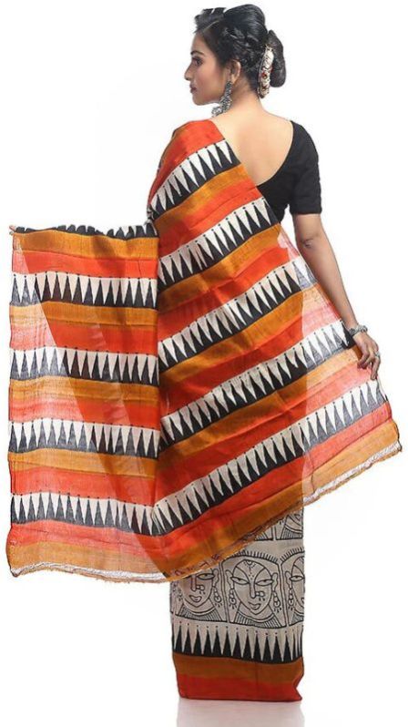 Enjoy the festive season with this Elegant Women's Bengali Tant Silk Sari. Beautifully designed in Off White & Oreange Color saree with Oreange threads all over floral motifs & zari border. Wide Border and Pallu is adorned with wonderful design motifs with colour thread and zari work mainly used for festival occasion purpose.