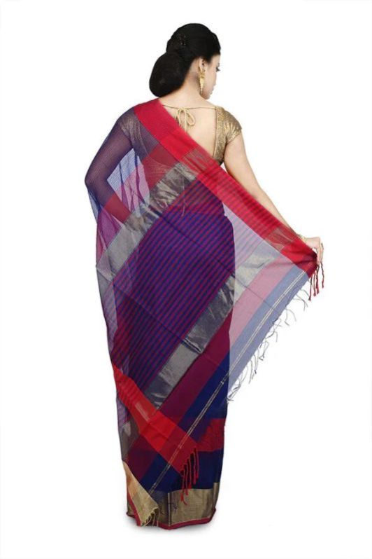 Made of silk and cotton, Blue colour saree with wide red & Golden border on pallu with zari work - look even more beautiful. It is also known for one of Indias finest fabric, and handloom weaving Traditional Maheshwari Saree. The graceful & sophisticated design is inspired by the local architecture and striped pallu. Once an exclusive privilege of the royalty has become an established choice of the woman. Free unstitch Blouse piece of this saree.
