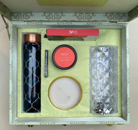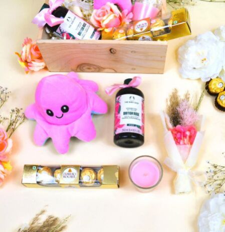 Celebrate in luxury with our premium gift hamper featuring the latest must-haves for ultimate pampering. Our set includes a mood plush toy to bring comfort and joy, a dried flower bouquet to add a touch of nature to your decor, The Body Shop shower gel for a revitalizing shower experience, a scented candle to create a relaxing ambiance and Ferrero Rocher chocolates for a sweet treat. Ideal for Valentine Day, birthdays, anniversaries, or just to spoil her, this gift hamper is the perfect way to treat their mind, body, and soul. Includes: Dried Flower Bouquet - PinkMood Plush ToyThe bodyshop shower GelFerrero RocherScented CandleGift BoxGreeting Card of your choicePerfect for those who appreciate the finer things in life, this hamper is sure to leave a lasting impression and bring a smile to their face on this special occasion. Order now and make this Valentine's Day unforgettable! Please mention any personalization or customisation requirement while checking out. For any other queries drop us a message on Whatsapp, link can be found on the bottom right corner.