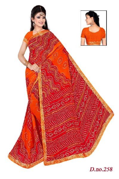 saree in traditional bandhej print heavy quality crispy georgette fabric bandhani saree with blouse piece dry clean or hand wash. 5.30 mts saree with 80 cms unstitched blouse piece premium quality superb printed saree with blouse piece