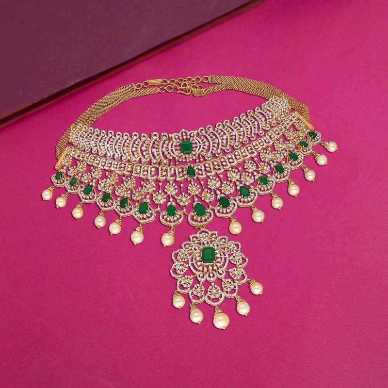 We offer a stunning 22K Delightful Diamond Choker Necklace, perfect for special occasions. Crafted with high-quality diamonds, this formal piece features a lobster clasp for secure wear. Packaged in an elegant jewelry box, this necklace exudes luxury and sophistication. Care instructions include avoiding contact with chemicals to maintain its brilliance. Ideal for exporters, suppliers, and traders looking to provide exquisite jewelry to their clientele.