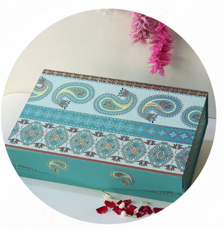 Elegantly wrapped in deep purples and intricate Mughal-inspired patterns, this gift box exudes class and culture. Inside, it features :