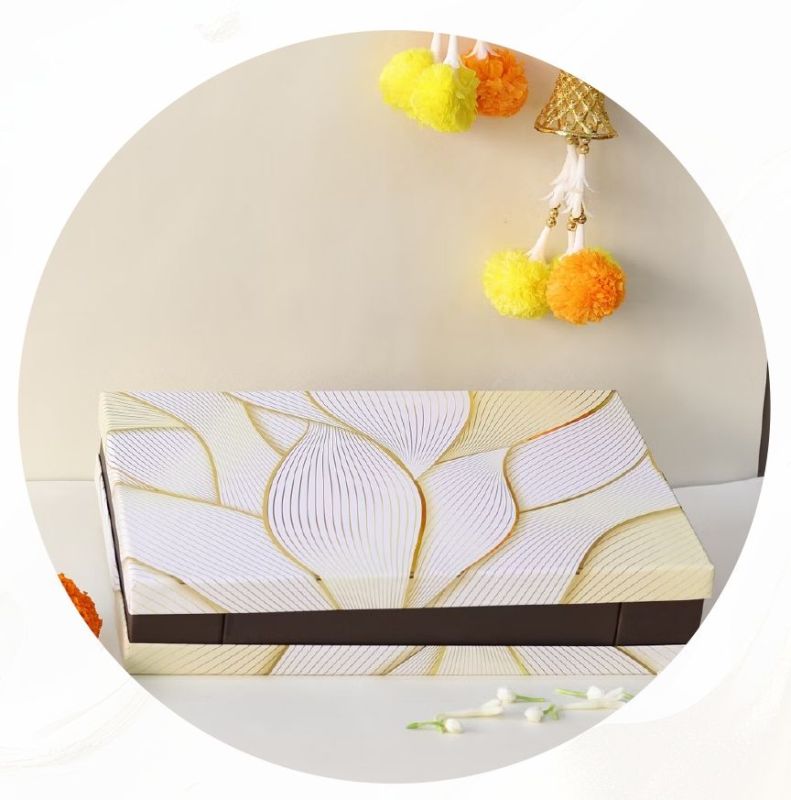 Encased in a textured ivory box with sleek gold detailing, this hamper opens to reveal a serene illustration of Rajasthan's royal courtyard, crowned by an intricate gold mandala 4 symbolizing harmony and luxury.