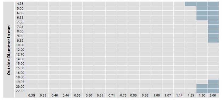 | Outer Diameter(in.) | Inner Diameter(mm) | 9mm TK(1.8m/piece) | 13mm TK(2m/piece) | 19mm TK(2m/piece) | 25mmTK(2m/piece) |