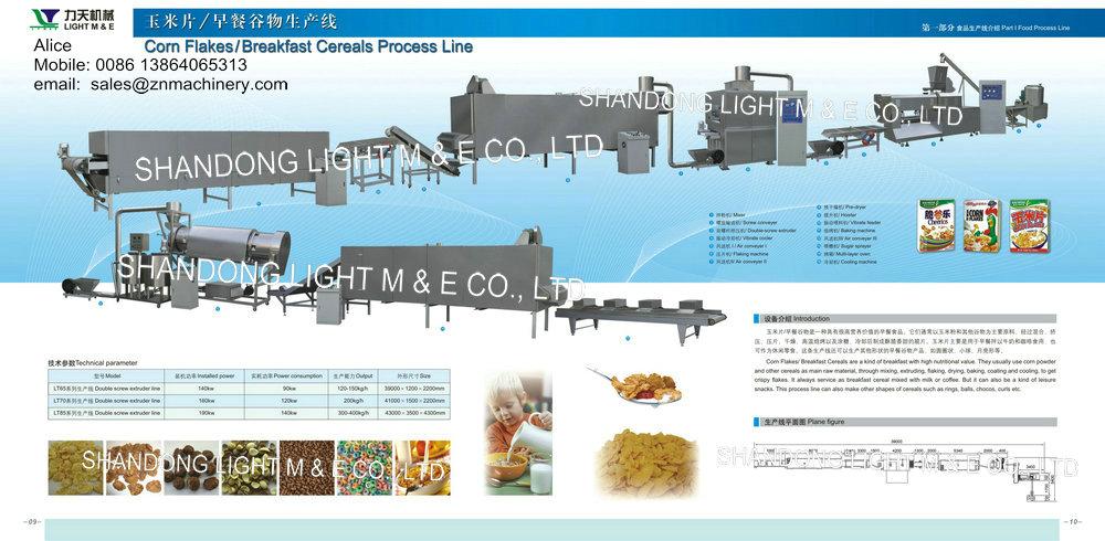 We are offering corn flakes, breakfast cereals process line etc.1 mixer2 screw conveyor3 double-screw extruder4 vibrate cooler5 air conveyor 6 flaking machine7 air conveyor 8 pre-dryer9 hoister10 vibrate feeder11 baking machine12 air conveyor 13 sugar sprayer14 multi-layer oven15 cooling machinecorn flakes/breakfast cereals are a kind of breakfast with high nutritional value. They usually use corn powder and other cereals as main raw material, through mixing, extruding, flaking, drying, baking, coating and cooling, to get crispy flakes. It always service as breakfast cereal mixed with milk of coffee. But it can also be a kind of leisure snacks. This process line can also make other shapes of cereals such as rings, balls, chocos, curls etc. model installed power power consumption output size lt65 double screw extruder line 140kw 90kw 120--150kg/h 39000x1200x2200mm