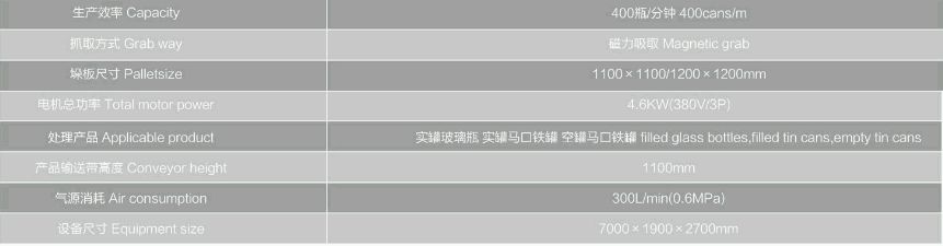 De-palletizer mainly is used to de-palletize various glass jar. It will de-palletizer the empty bottle from stack to conveyor again and again. Save much manpower, improve working efficiency.