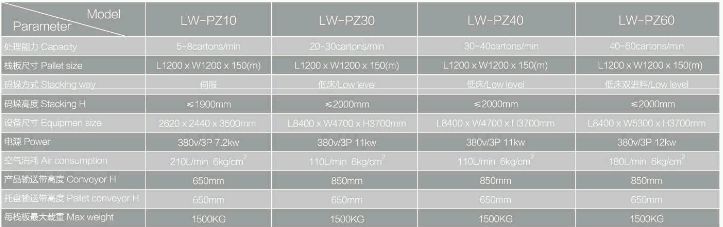 LW palletizers series of palletizer is used for food and beverage, chemical industry, etc.; It is suitable for all kinds of cartons, plastic boxes, the stretch film and barrels, and other types of packaging's stack , Machiner is made of different speed of belt, Steering mechanism Sorting box Area Carton Pallet Are main part lifting mechanism Pallet output roller line etc.
