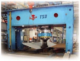 The hydraulic press is an equipment for cold and hot shape processing such as thick plate bending .side bending , rib pressing and ship plates flattering , mainly used for the cold and hot shape processing such as skin shaping alld pressing cavity bulkhead and ship pots etc , and is also the key equipment for thick plate shape processing in the petro-chemical and boiler industries . The principle machine of the product adopts integral single column and combined singlecolumn and combined frame crane with high rigidity body and both of structure of normal press head pressing and turnover pressing of movable press-head and table for meeting demands of various size shape processing accuracy of thick plate . The hydraulic control system is composed of plug-in integrated valve .the speed and the pressure of press head can be adjusted ar-bitrarily with in the prescribed limit of parameter so the pressing process is controllable .the electric control system is controlled by the computer and plc and equipped the whole stroke position collection and checking devices that can realize the digital control of digital heavy load mechanic driving and pressing .parameters so as to keep the forming precision. the hydraulic press is equipped with lifting device and roll-conveying device to keep high efficient shape processing and with hydraulic lock device to prevent the press head form slipping and remote control device.