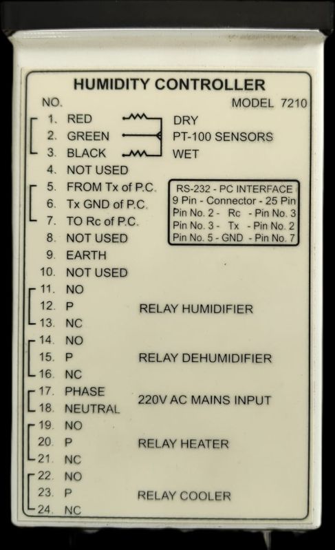 Control Output : Humidifier ON for RH < SET HUMID 1%De-humidifier ON for RH > SET HUMID + 1%Heater ON for Temp. < SET TEMP 0.5%Cooler ON for Temp. > SET TEMP + 0.5 C