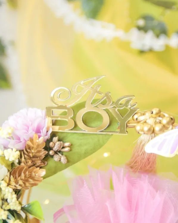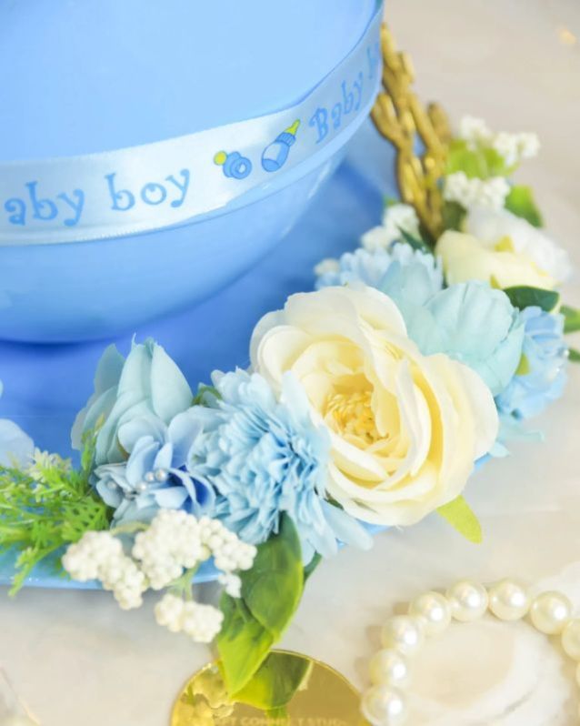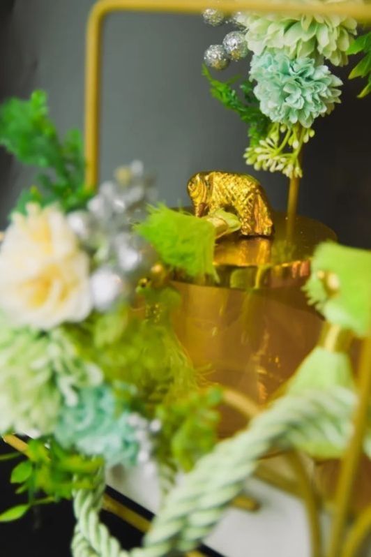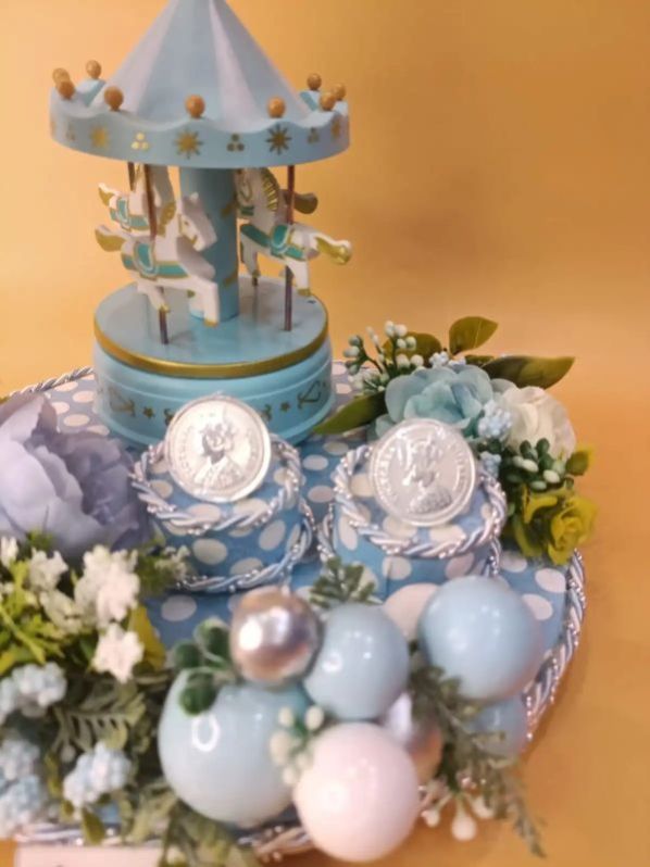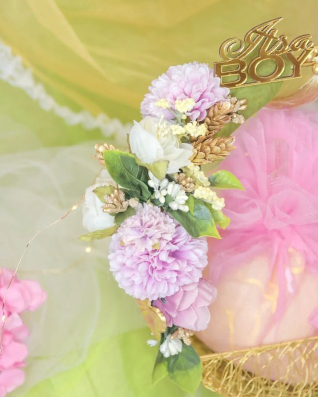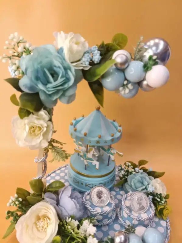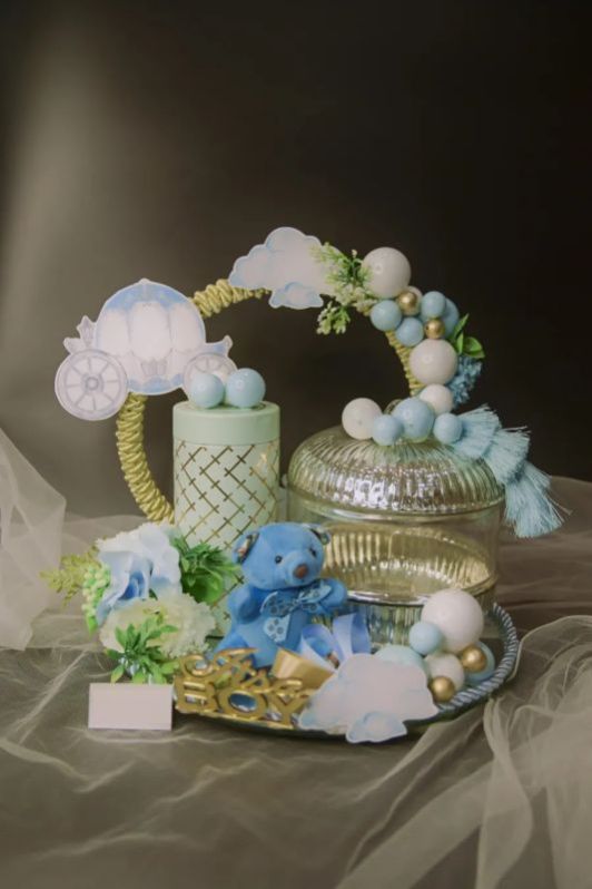Products provided by the customer and price mentioned includes only decor, balloons and base. Decoration done with Fabric Flowers. Gifts can be arranged for customers on prior notice and intimation. The decor is done on Metal platter.