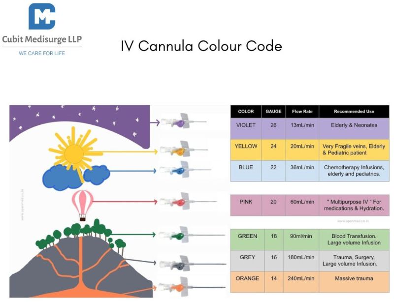 | 26G | Purple | 0.6 mm | 13 mL/min | Neonatal/pediatric intensive care |