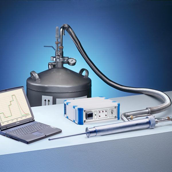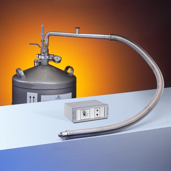 KALTGAS is a temperature control system that relies on the low temperature of liquid nitrogen as a refrigerant. The liquid nitrogen is evaporated in a cryogenic vessel using a heater (jet). This creates a constant, cryogenic gas stream. By varying the heater (jet), both the cooling capacity and the gas flow volume can be modified, and by varying the jet power, the liquid nitrogen consumption can be reduced to the necessary minimum. The cryogenic gas stream is then piped to the object to be cooled through a vacuum-insulated, flexible metal line. A KALTGAS system can generate a gas stream as cold as -180C within just a few minutes.