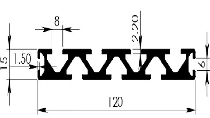 With a cross-section of 15mm x 120mm, this profile offers a unique balance of rigidity and flexibility in design. Each meter of the profile weighs approximately 2.11 kg ±150 grams, ensuring excellent load-bearing capacity without adding excessive weight to the overall structure. The high surface area of 794 mm² enhances stability while maintaining a sleek, compact form suitable for both lightweight and heavy-duty applications.