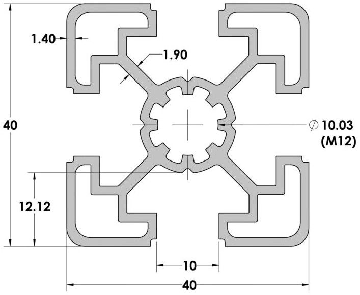 The Dexterous 40x40 T-Slot Profile features a slot width of 10.2 mm (0.2), designed for use with M12 T-nuts, bolts, and fasteners, ensuring compatibility with a broad range of aluminium profile accessories. The center hole diameter of 10 mm allows for M12 threading or self-tapping, enabling quick and secure connections during assembly.